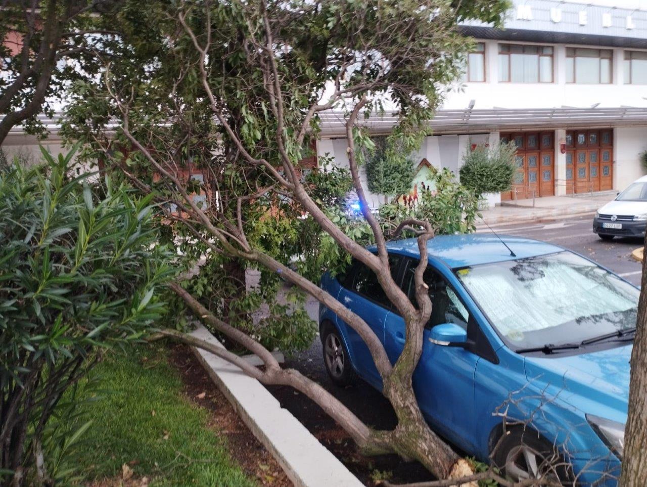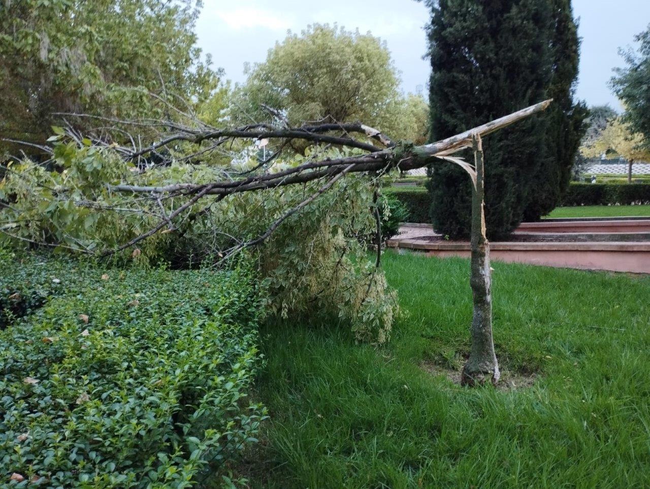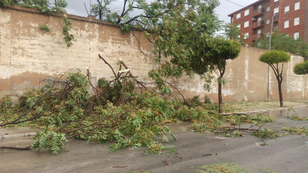 Efectivos de la Brigada de Obras, electricistas, personal de la empresa de jardinería, Policía Local y Protección Civil, Policía Local, intervenían ayer y siguen actuando para solucionar los problemas generados, en el casco urbano, como consecuencia de la breve pero intensa tormenta de lluvia (unos 10 litros por m2), acompañada de ráfagas de viento de hasta 80 Km/hora y granizo, que se producía en nuestra ciudad, poco después de las 18 horas de ayer, por espacio de unos 15 minutos