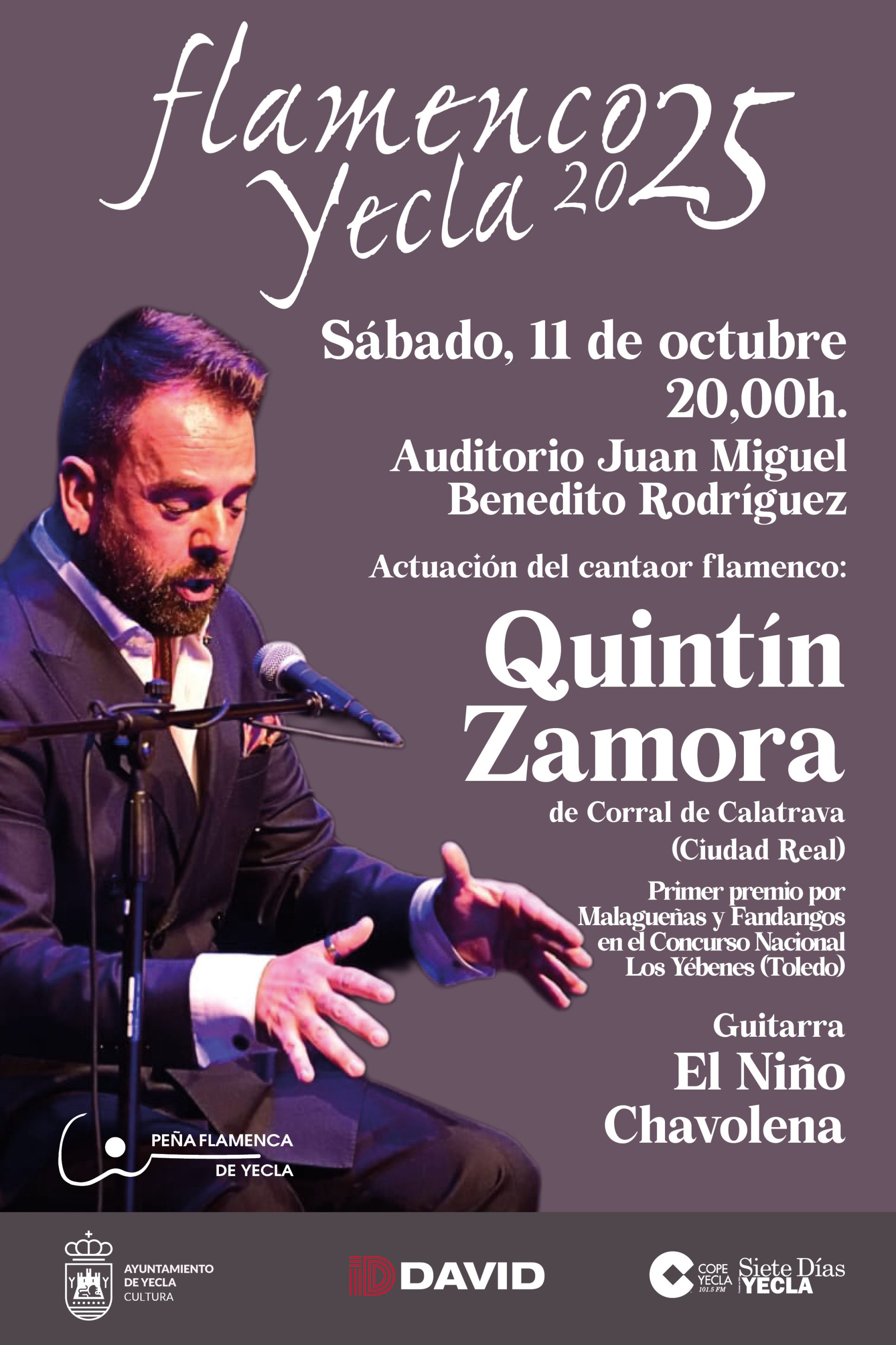 La Peña Flamenca de Yecla arranca el nuevo curso este sábado 11 de octubre, a las ocho de la tarde con la actuación del cantaor Quintín Zamora en el Auditorio ‘Juan Miguel Benedito Rodríguez’. Se trata de un cantaor de Corral de Calatrava (Ciudad Real) que, como explica el vicepresidente de la Peña, Pedro Benjamín Muñoz, “nos viene muy recomendado de los Festivales de La Unión y Lo Ferro. Aunque toca todos los palos, es un experto en malagueñas y fandangos, y ha sido primer premio en los certámenes de Los Yébenes (Toledo) y Valdepeñas (Ciudad Real), dos concursos nacionales de enorme prestigio. Además, él tiene grabado un disco y viene acompañado a la guitarra del Niño Chavolena”.