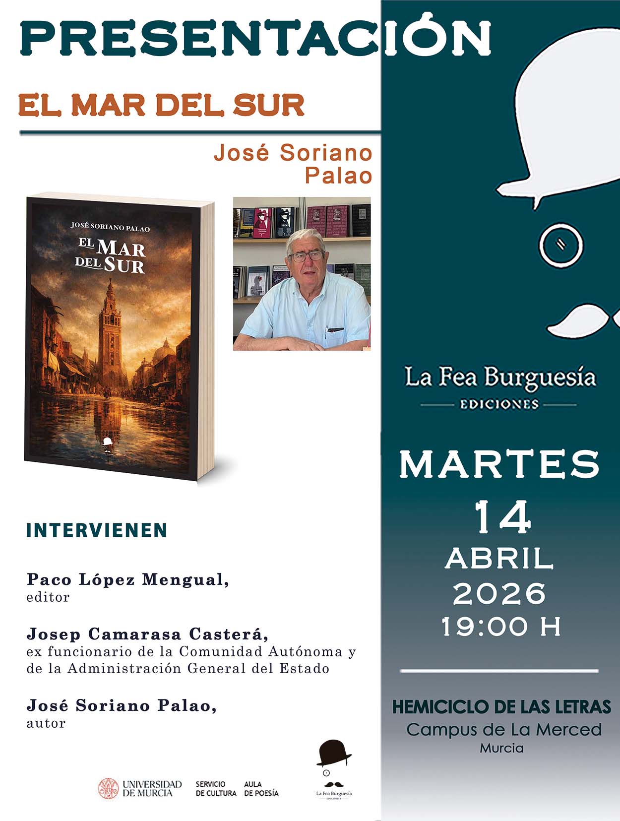 Hoy martes, 14 de abril tendrá lugar la presentación de la novela El Mar del Sur, obra de José Soriano Palao, que marca su primera incursión en el ámbito de la ficción histórica. El acto, que contará con la intervención del propio autor, acompañado por Josep Camarasa Casterá, ex funcionario de la Comunidad Autónoma y de la Administración General del Estado y Paco López Mengual, editor de La Fea Burguesía, será en el Hemiciclo de las Letras de la Facultad de la Merced (Universidad de Murcia) a las 19:00 horas.