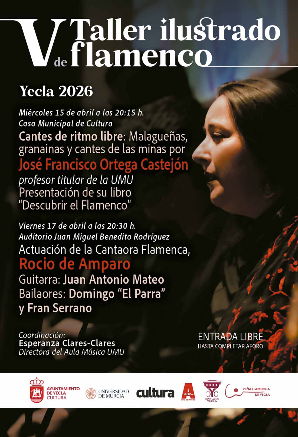 Con esta actuación termina el V Taller Ilustrado de Flamenco, que está coordinado por el Aula de Música de la Universidad de Murcia, a través de su directora, Esperanza Clares-Clares, en estrecha colaboración con la Concejalía de Cultura del Ayuntamiento de Yecla a través de la Peña Flamenca.